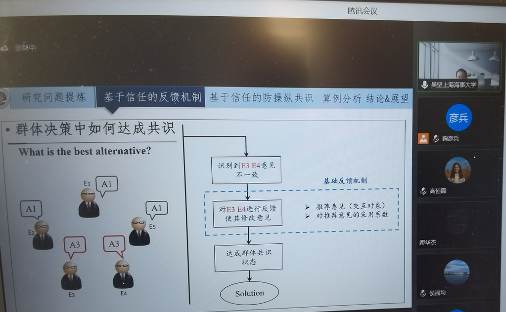In the report, Professor Wu Jian combined with his research results over the years, and thoroughly explained the group consensus decision-making problem based on social network trust from the aspects of research problem extraction, trust-based feedback mechanism, trust-based anti-operation consensus, example analysis, conclusion and outlook. Professor Wu Jian first analyzed the defects of the traditional group consensus: the static method is used to gather user preferences without considering the interaction between group members, which can not improve the satisfaction of the group and the accuracy of recommendation. Then, in view of the shortcomings of traditional consensus decision-making methods, the importance of exploring group consensus decision-making based on social network trust is pointed out, and the trust-based feedback mechanism and trust-based anti-operation consensus in group decision-making are deeply analyzed. Finally, an example is given to illustrate the practicability and effectiveness of the group consensus decision-making method based on social network trust, and the future research directions are given.
