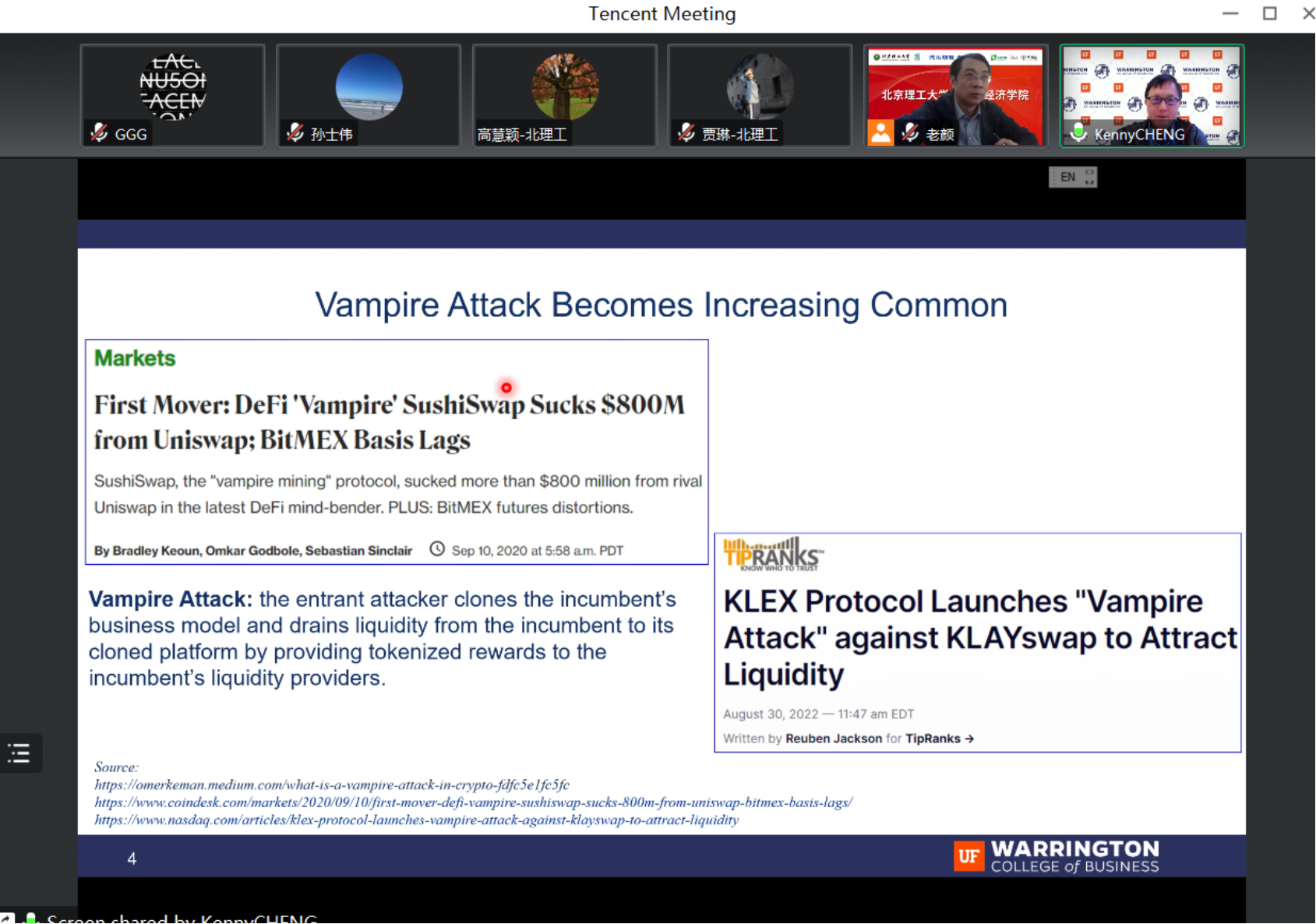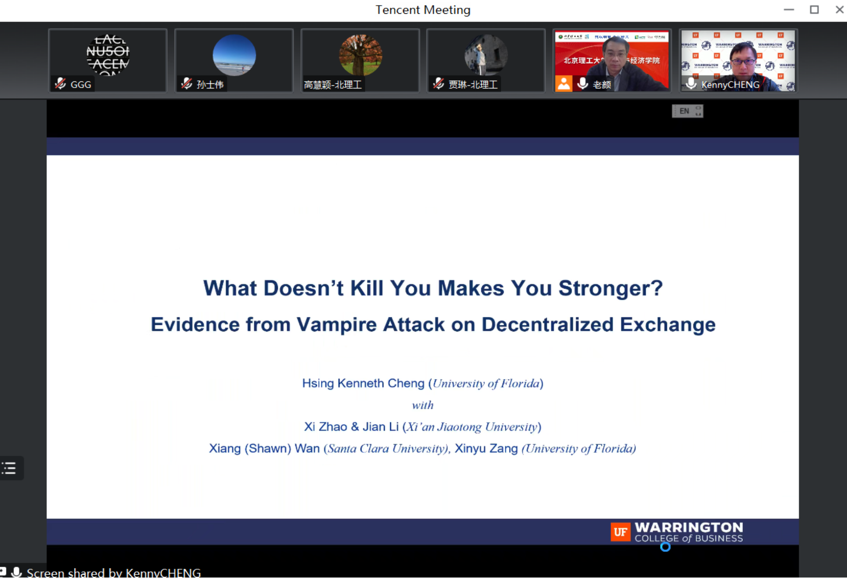 应管理与经济学院的邀请,佛罗里达大学Warrington商学院的Hsing Kenneth Cheng教授于2023年3月21日上午10点在线上做了题为《Evidence from Vampire Attack on Decentralized Exchange》的学术报告。报告会由颜志军教授主持,学院众多师生参加了本次报告会。