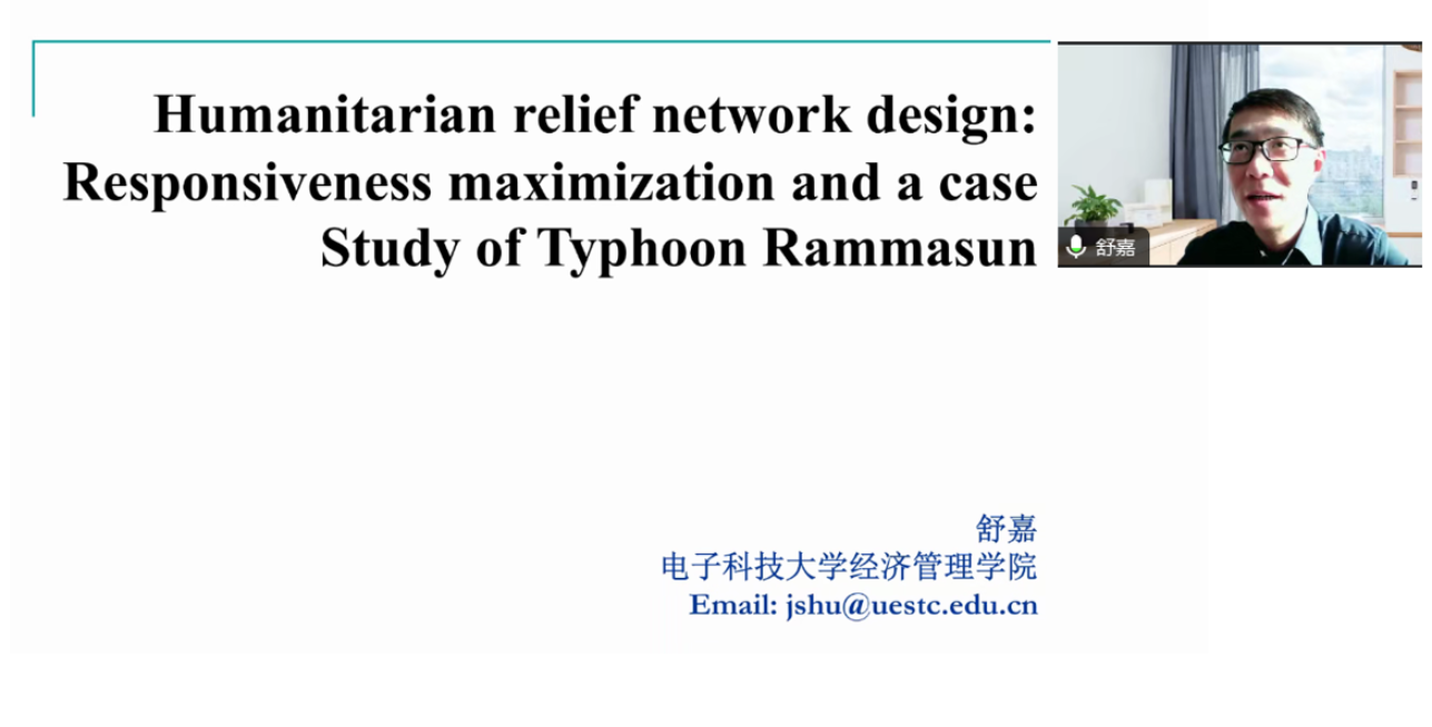 舒嘉教授首先以近年来遭受自然灾害的相关数据和相关机构的规定为例,指出人道主义物流灾害救援网络体系规范与优化是需要学者密切关注的重要研究方向。接着,舒嘉教授以一个人道主义救济网络的设计问题为研究切入点,其中每个受灾地区对救援物资的需求是不确定的,并且可以由多个救援设施来满足。在一定的成本预算下,可以同时优化救援设施选址、库存预定位、救援设施对受灾地区分配等决策,使响应能力最大化。随后,舒嘉老师针对此问题,提出了一个带有机会约束的理论模型,该模型可以根据每个受影响区域的需求信息来求解,相较于确定性模型更加智能化,可适应性得到了显著提高。同时,根据通过2014年台风“威尔逊”影响我国广东、海南等地的相关数据验证了该模型的实际效果,为持续优化人道主义救援网络设计工作提供了新的思路与见解。