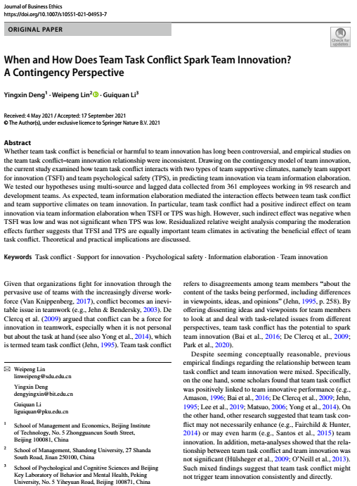 我院邓英欣老师有关任务冲突激发团队创新的研究被FT50期刊《Journal of Business Ethics》接收